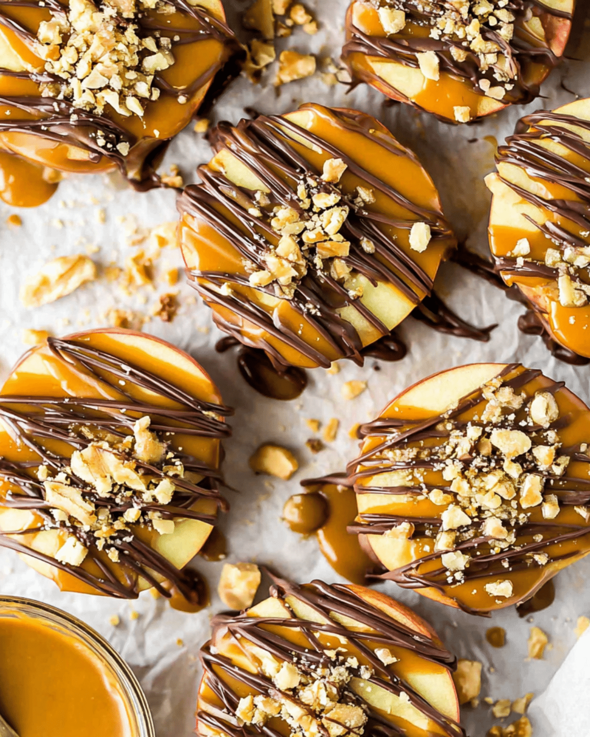 - Drizzle the melted chocolate over the caramel-coated slices. Add toppings while wet.