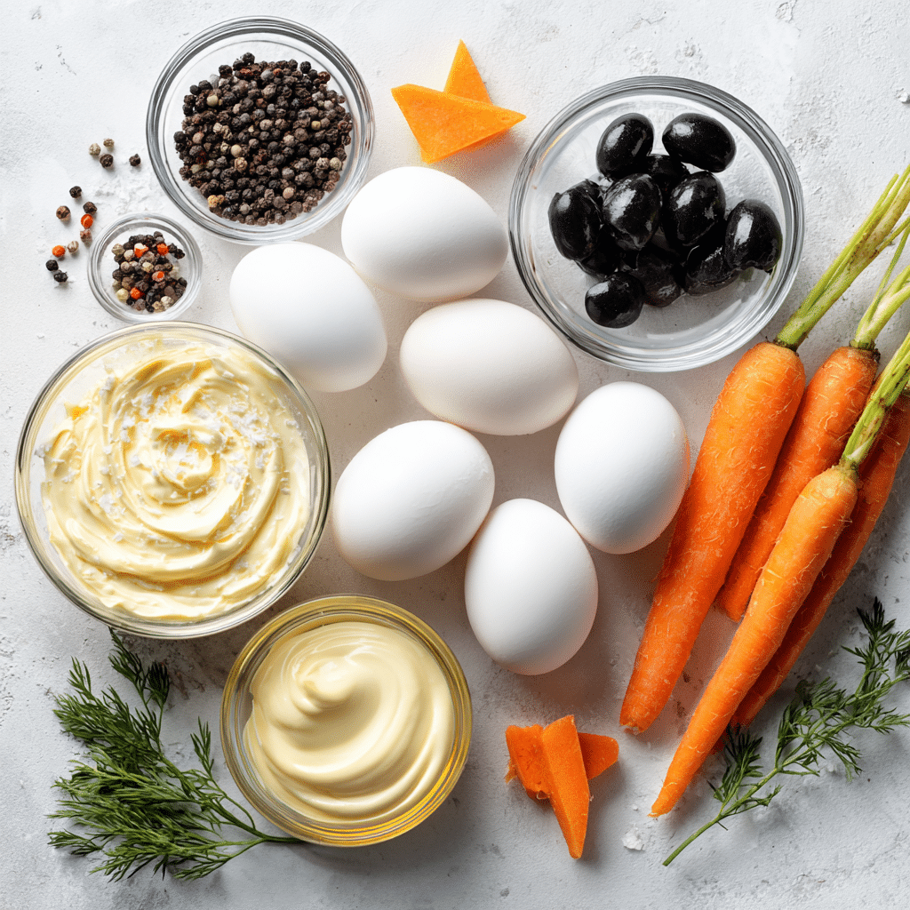 Chick Deviled Eggs are a creative version of traditional deviled eggs where the eggs are decorated to resemble baby chicks. The egg whites act as the shell, while the creamy yolk filling forms the chick’s face. Small decorative elements such as carrot pieces and peppercorns are used to create beaks and eyes.