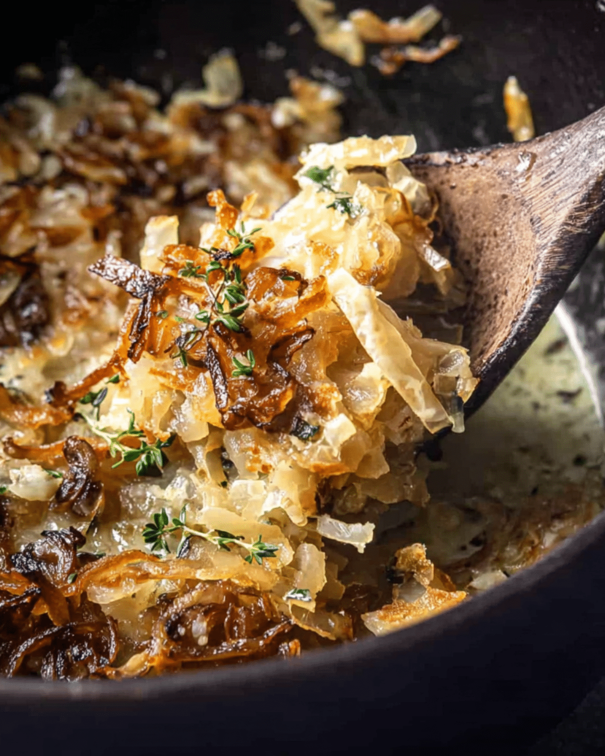 The soul of any French onion soup is deeply caramelized onions—and this creamy version is no different. Start with yellow onions, thinly sliced, and melt them slowly in butter over medium heat. Add a touch of honey to encourage quicker browning, but be patient—this step takes time.