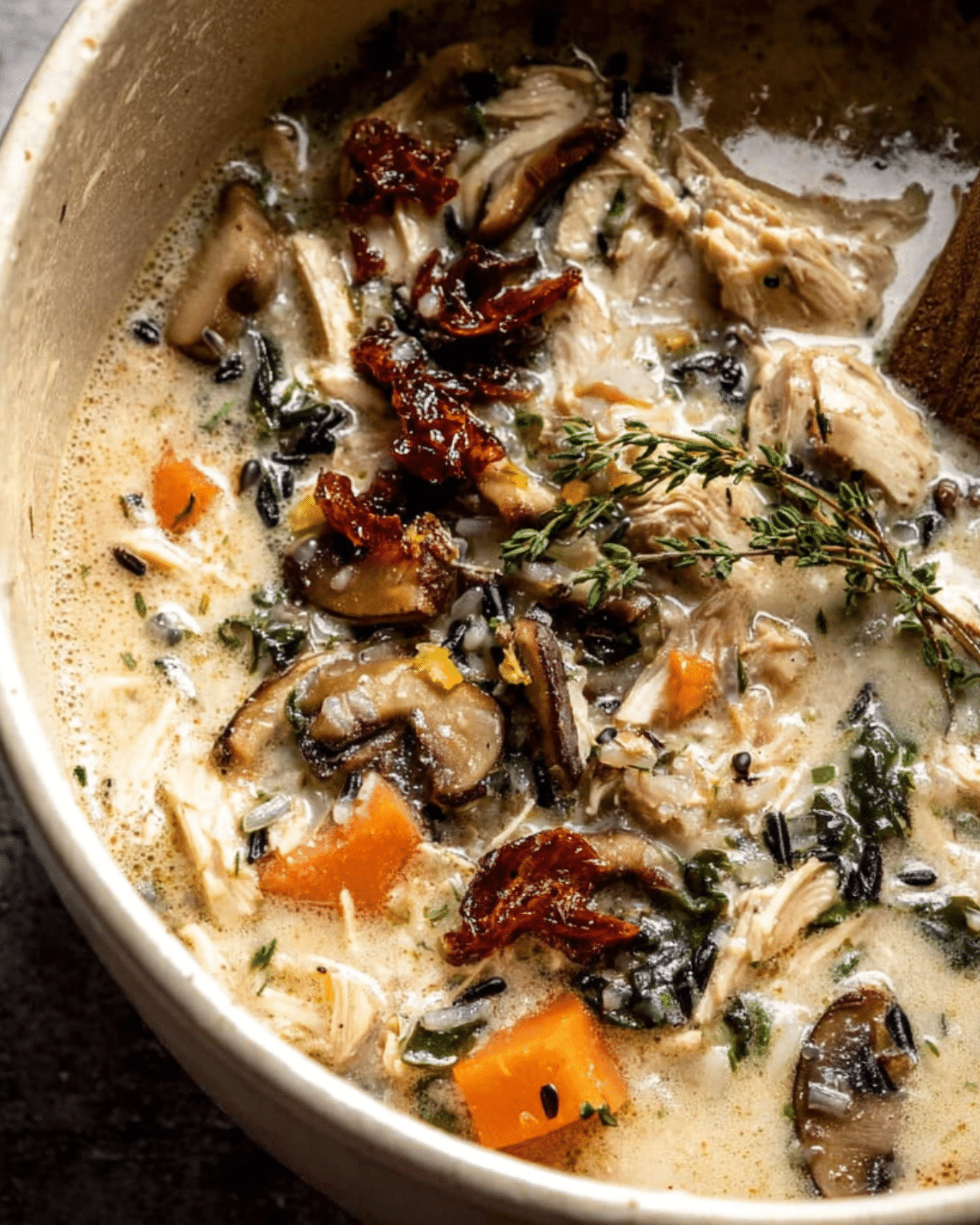 PrintCreamy Wild Rice Chicken Soup with Roasted Mushrooms