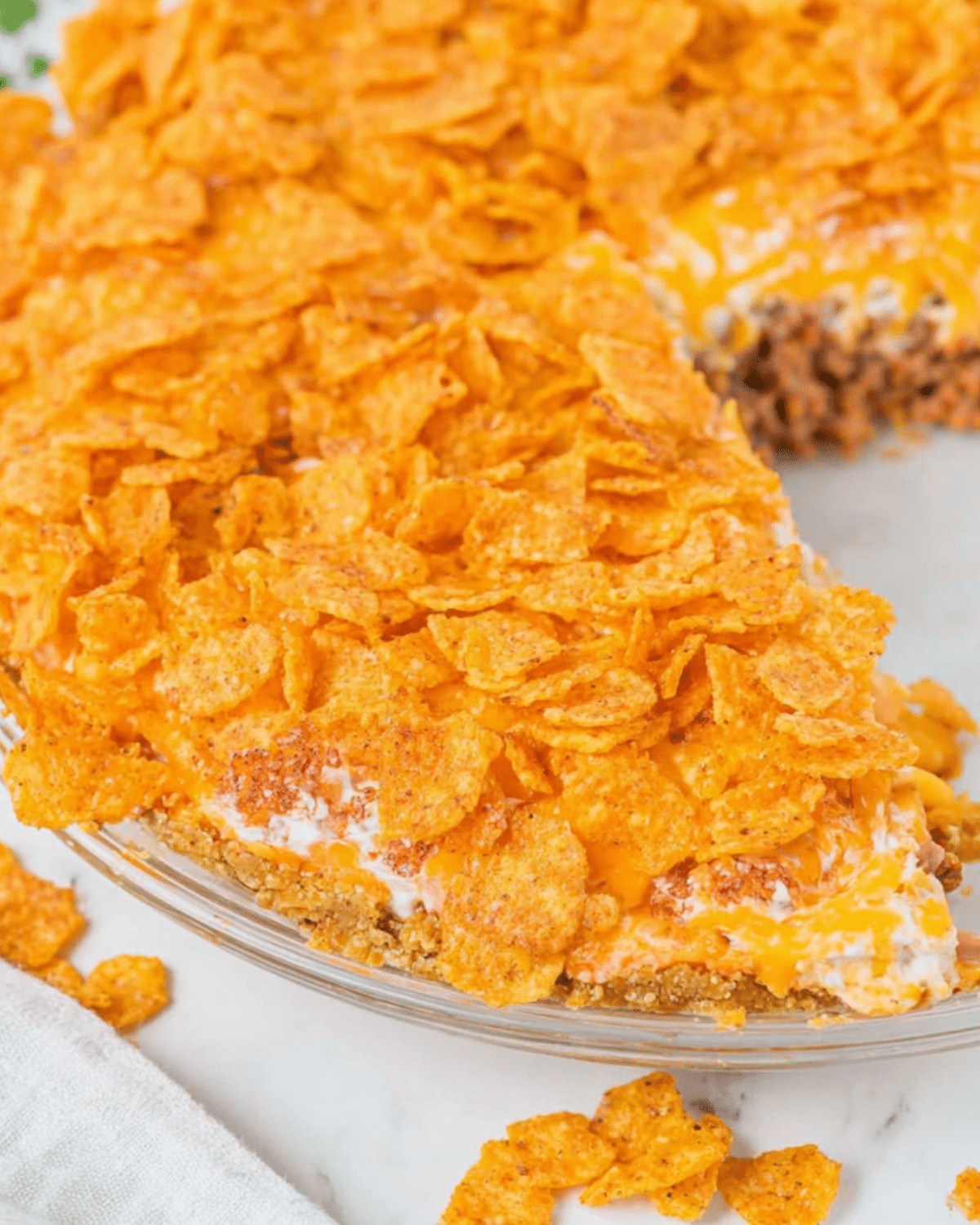 Bake for 20–25 minutes or until the crust is golden and the top is crisp. If the Doritos begin to brown too fast, cover loosely with foil—just be sure the crust edges stay exposed so they cook properly. Let the pie sit for 5–10 minutes before slicing to keep layers intact.