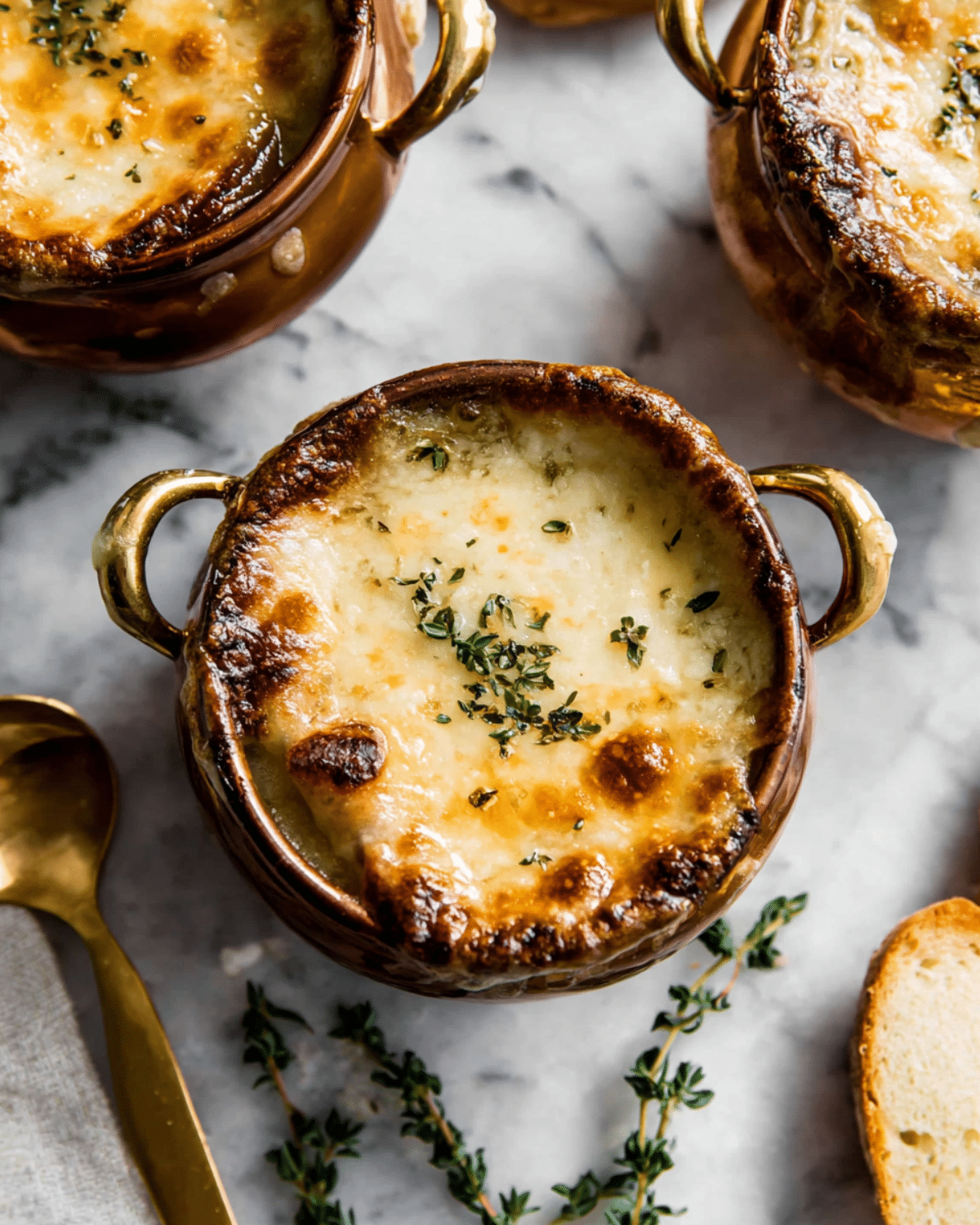 To get that perfectly melted, golden cheese top, you’ll need oven-safe ramekins or soup crocks. Always place them on a baking sheet when broiling to catch any drips. Watch closely while under the broiler—it only takes a minute or two for the cheese to go from melted to perfectly blistered. Avoid over-stacking the cheese to prevent overflow.