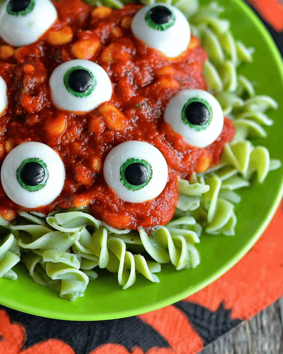 If spinach pasta isn’t available, turn regular noodles into green goo with a drop of food coloring while boiling. Prefer a blood-curdling effect? Add red or even black coloring to the sauce. Want to go bold? Use squid ink pasta for a jet-black base that makes those eyeballs really pop. The key is to contrast the eyeball whites with the pasta’s shade.