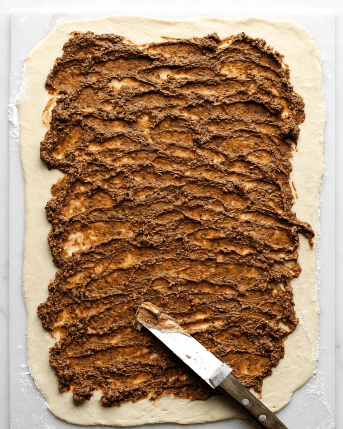 Roll out the dough into a 20 x 12-inch rectangle. Evenly spread the filling over the dough with a palette knife, ensuring full coverage to the edges.
