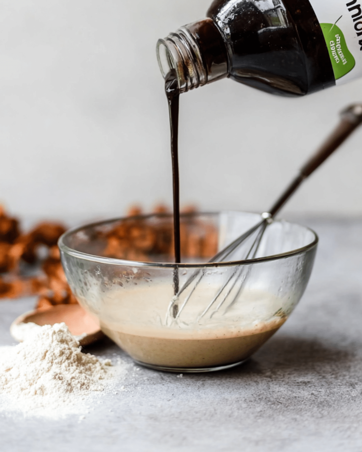 - In a separate large bowl, whisk together egg, molasses, coconut sugar, vanilla extract, and milk.