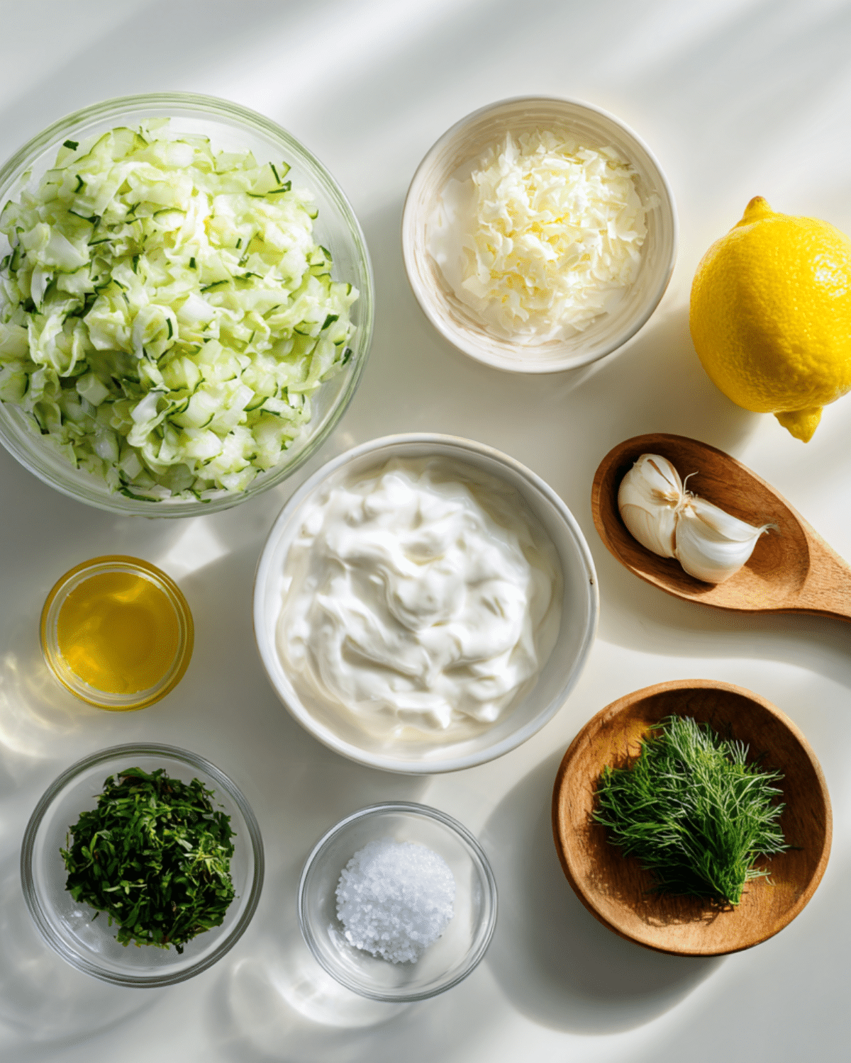 - In a medium mixing bowl, combine the Greek yogurt, grated cucumber, minced garlic, olive oil, lemon juice, and chopped dill.