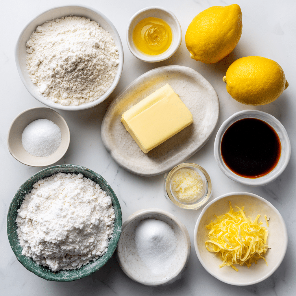 Fresh lemon zest is essential because it carries the most intense citrus aroma. Lemon juice adds tangy brightness and deepens the lemon flavor. Baking soda or baking powder helps the cookies rise slightly and stay soft. Salt balances the sweetness and sharpens flavor.