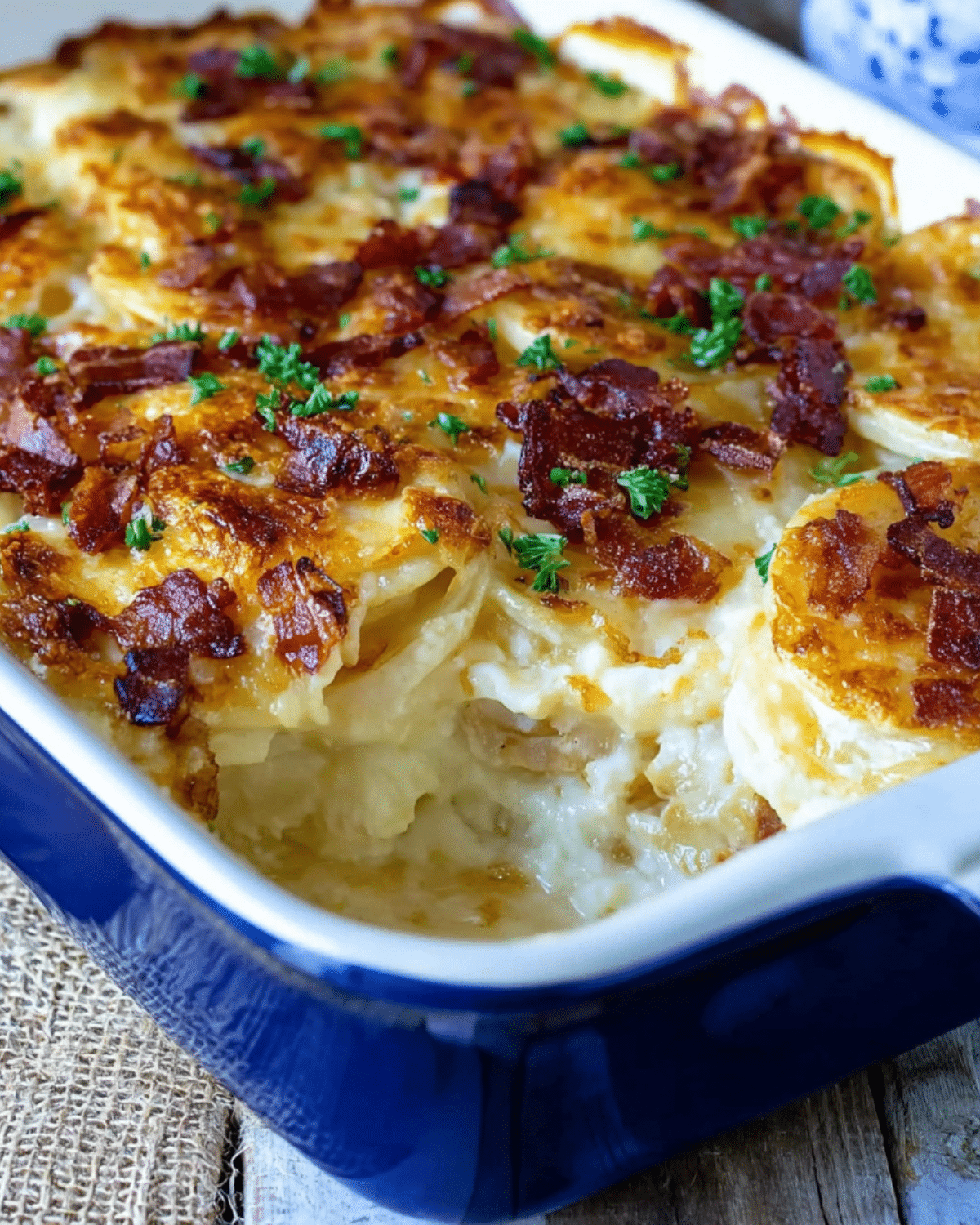 Loaded scalloped potatoes are a rich and comforting side dish layered with thinly sliced potatoes, creamy cheese sauce, crispy bacon, and finished with chives. Perfect for holidays, potlucks, or cozy family dinners.