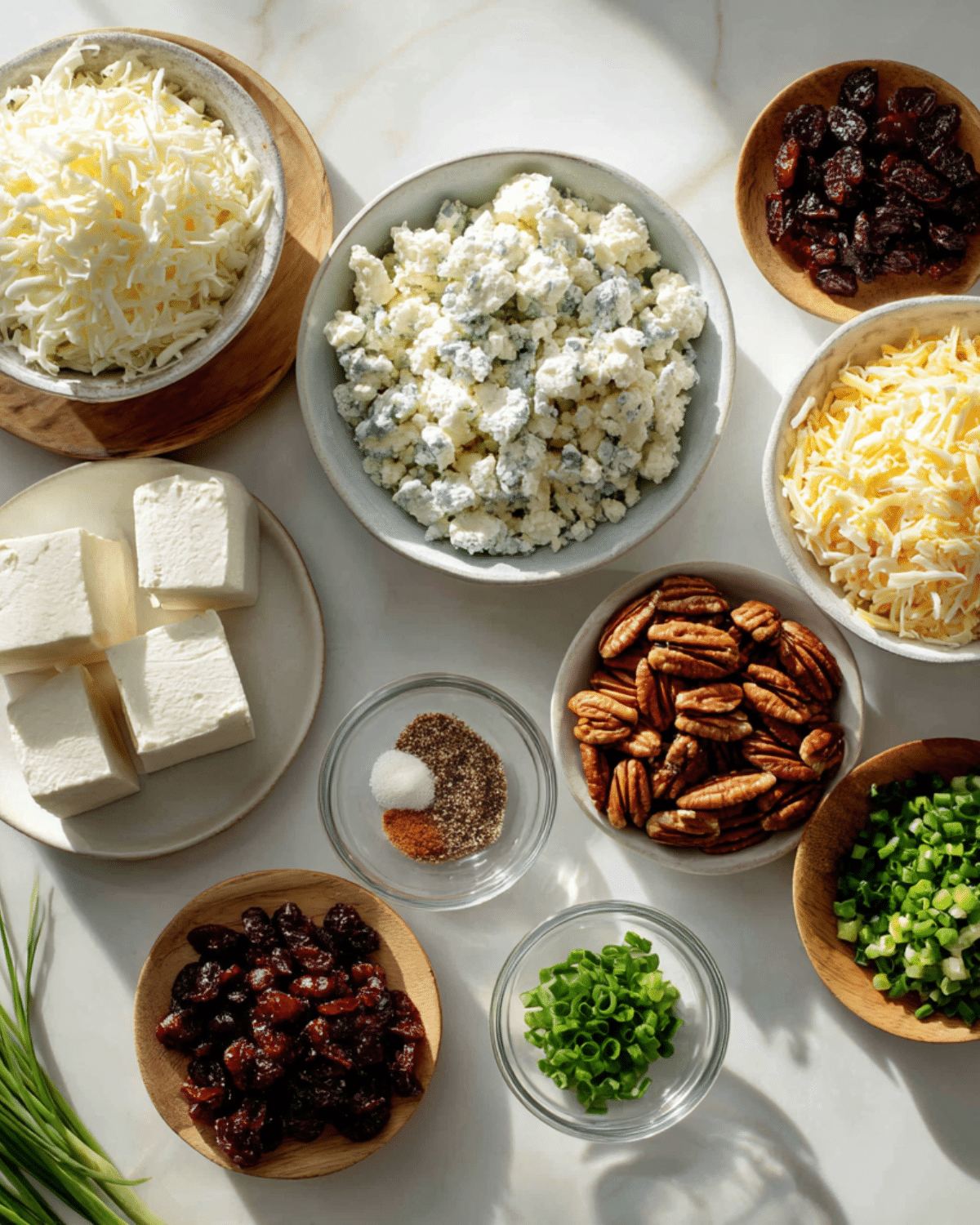 - In a separate bowl, mix the remaining cranberries, pecans, and chopped chives.
