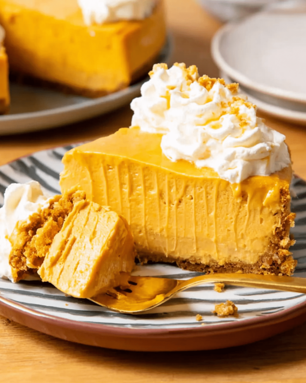 Classic whipped cream and caramel drizzle are the go-to choices. Feeling creative? Garnish with crushed gingersnaps, toasted pecans, or a sprinkle of cinnamon. For a twist, swap in canned sweet potato or squash purée. You can even turn it crustless for a gluten-free, low-carb dessert.
