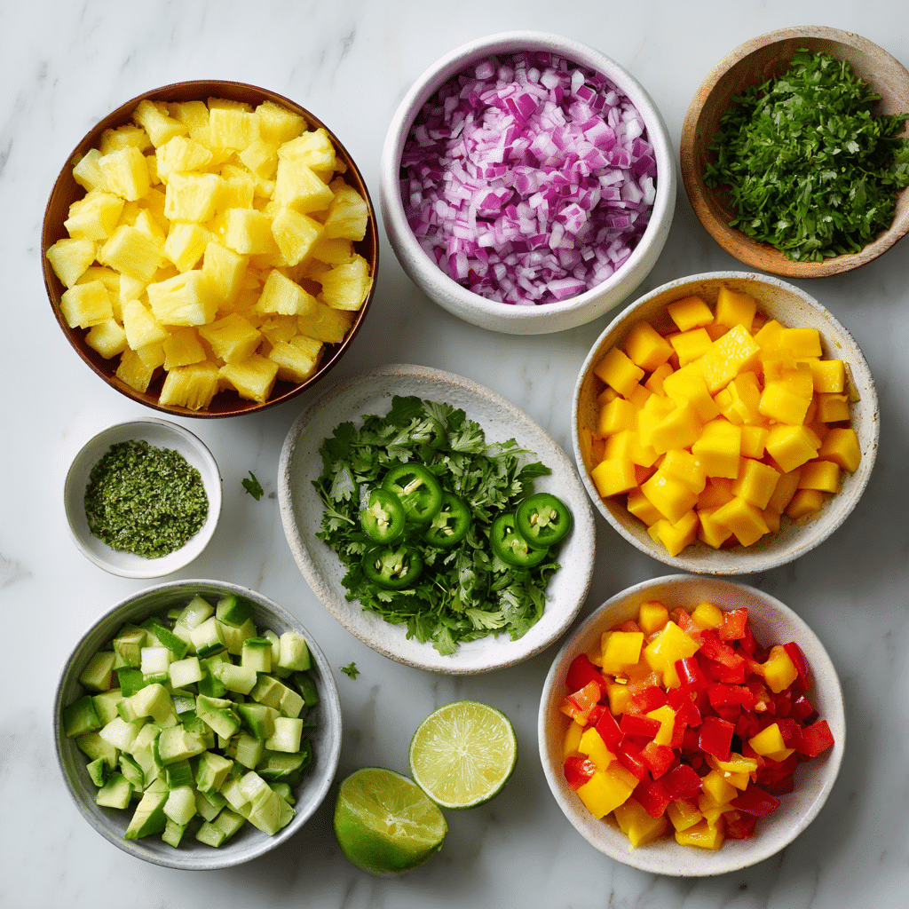 To make pineapple mango salsa, you will need fresh pineapple, ripe mango, red onion, cilantro, jalapeño, lime juice, and salt. Pineapple provides a juicy, tangy base, while mango adds natural sweetness and smooth texture.