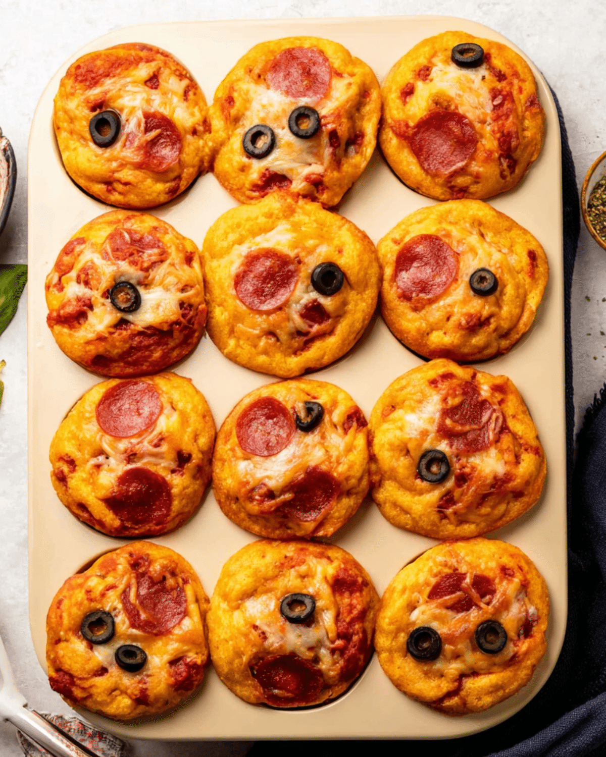 From finely chopped pepperoni and shredded mozzarella to black olives and extra pizza sauce swirled on top—these muffins can be as basic or bold as you like. Love a Hawaiian twist? Toss in diced pineapple. Want more veggie action? Try mushrooms or bell peppers.