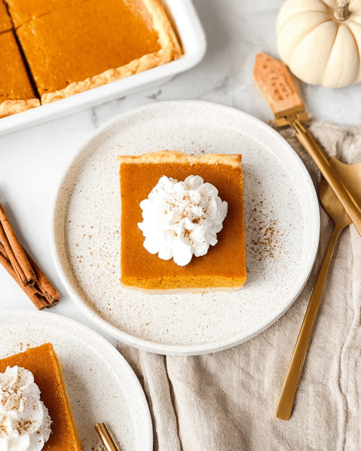 Want to make your Pumpkin Slab Pie ahead of the holidays? Simply freeze it. After the pie cools completely, cut it into individual squares and place them on a parchment-lined tray. Freeze until firm, then wrap each square tightly in plastic wrap and place them into a freezer-safe zip-top bag.
