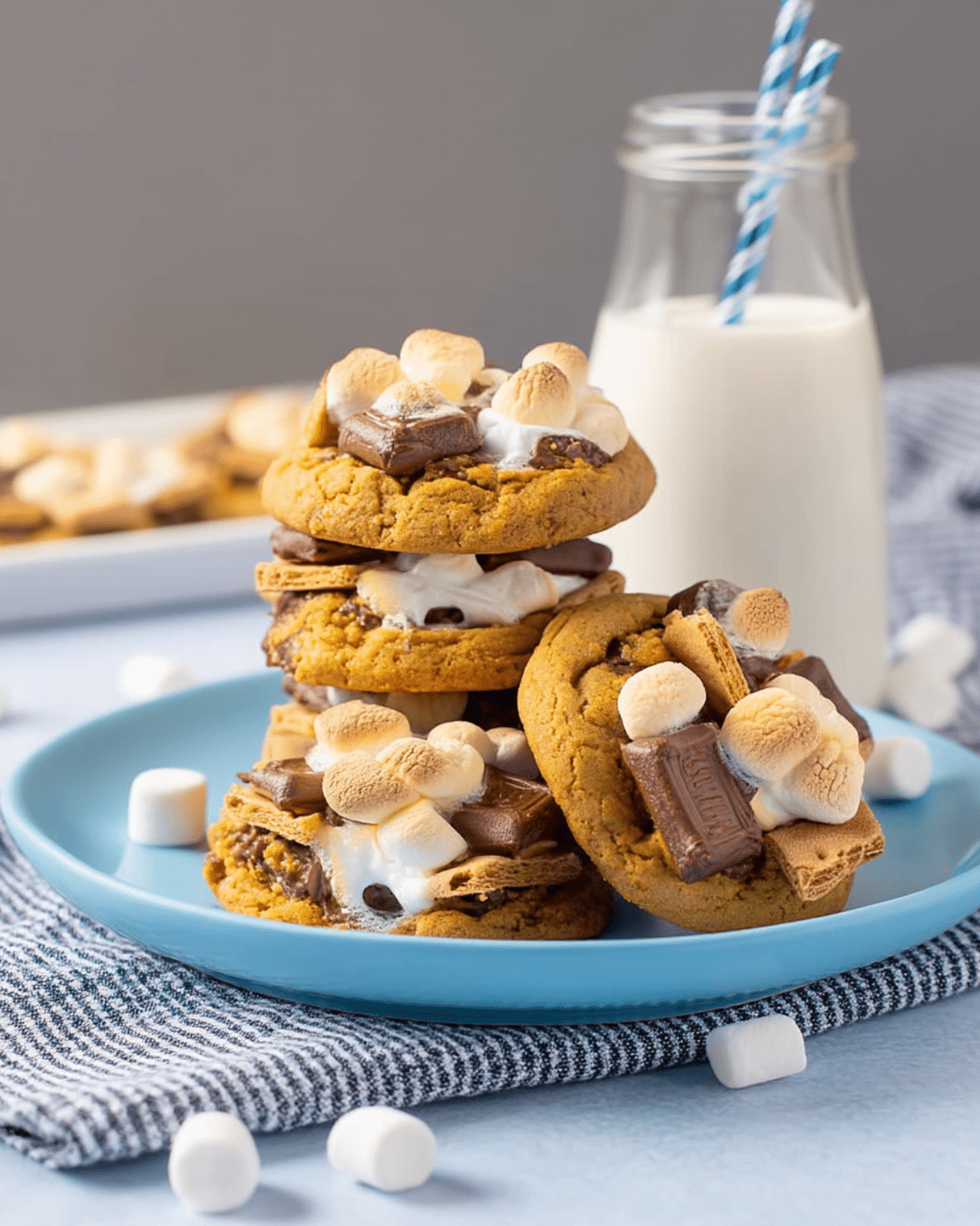 Soft pumpkin spice cookies topped with gooey marshmallows, rich chocolate chunks, and crunchy graham crackers, combining the best of fall flavors with nostalgic s’mores elements