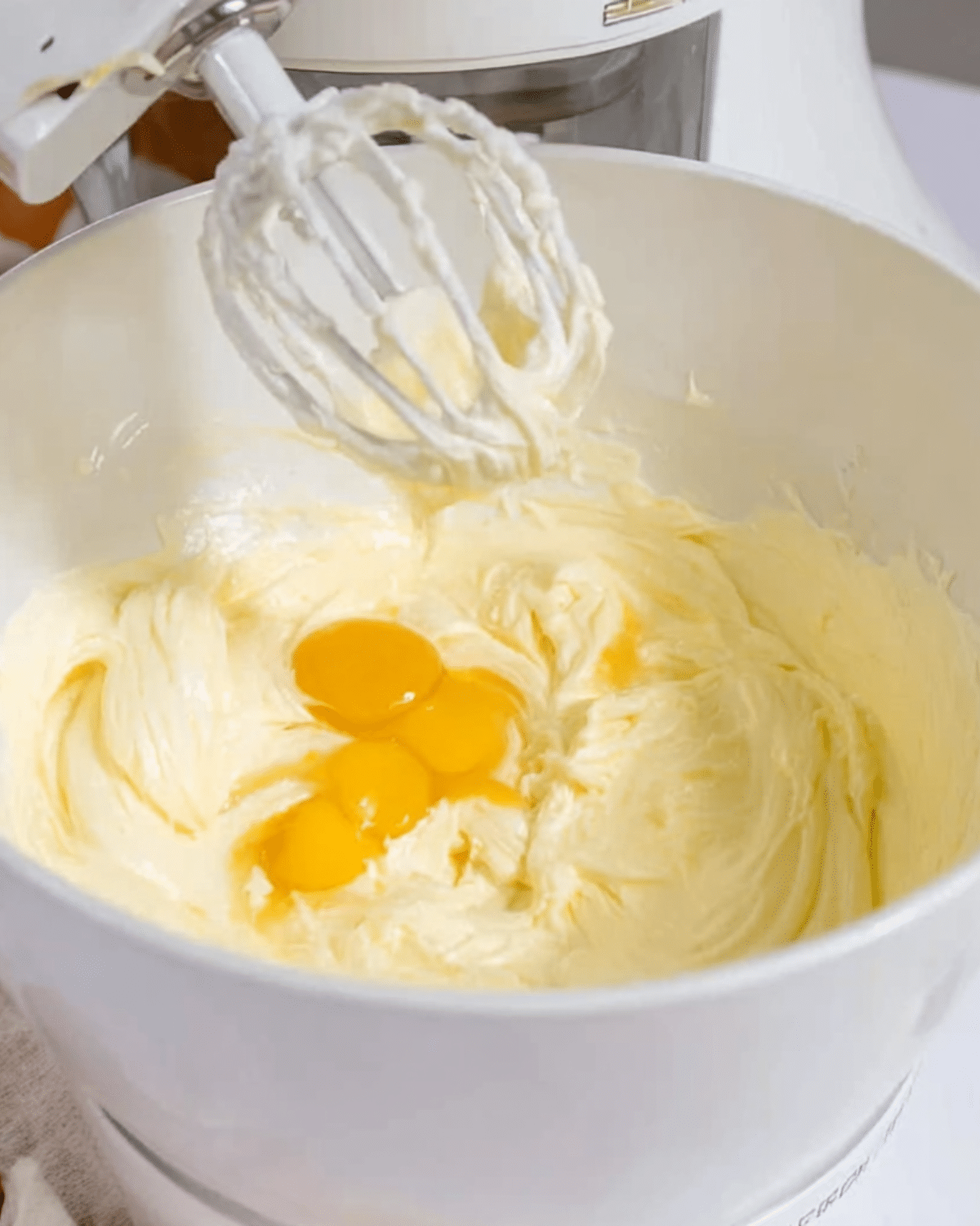 - In a stand mixer, blend cream cheese until smooth. Add sugar, vanilla, and eggs one at a time on low speed.