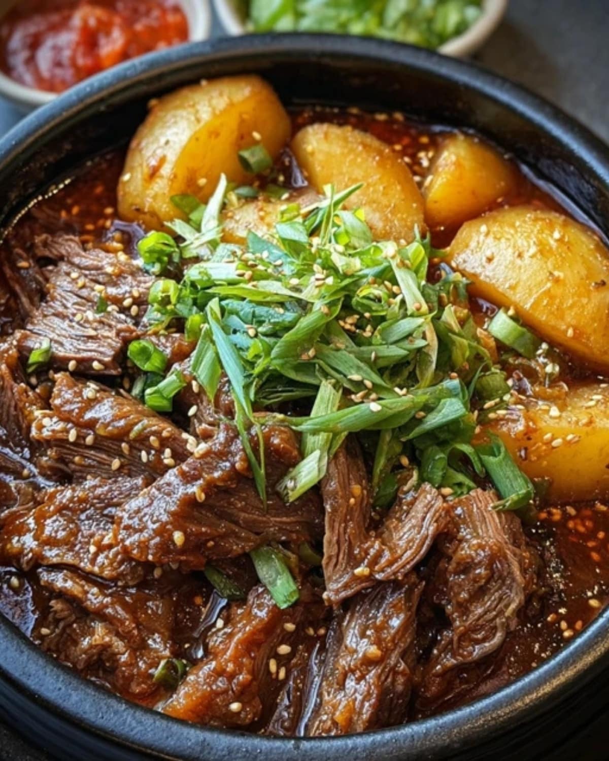 Then gently fold in sour cream. Return the beef to the pot and simmer for 3–5 minutes until everything is heated through.