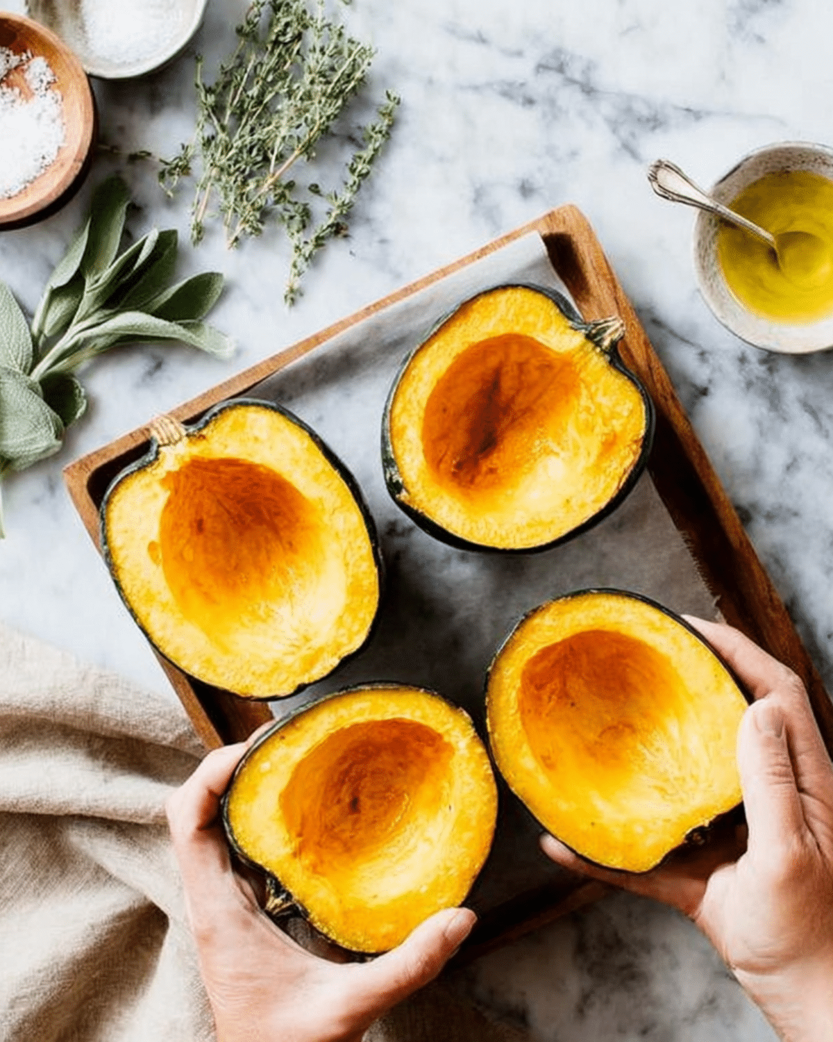 - Sprinkle chopped fresh sage and/or rosemary into the center of each squash half.