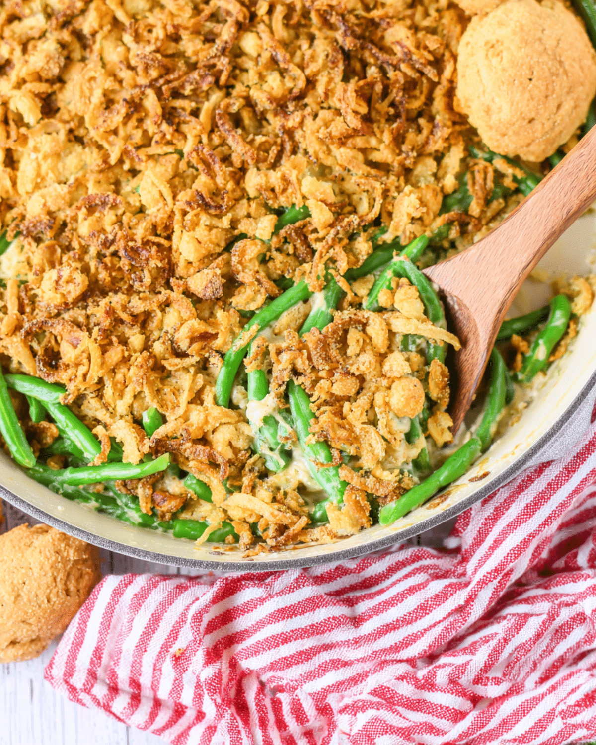 Prepare the casserole a day ahead but wait to add the fried onions until just before baking to keep them crispy. Leftovers keep in an airtight container in the fridge for up to 4 days. Reheat at 325°F until warm, or microwave individual portions for quick servings.