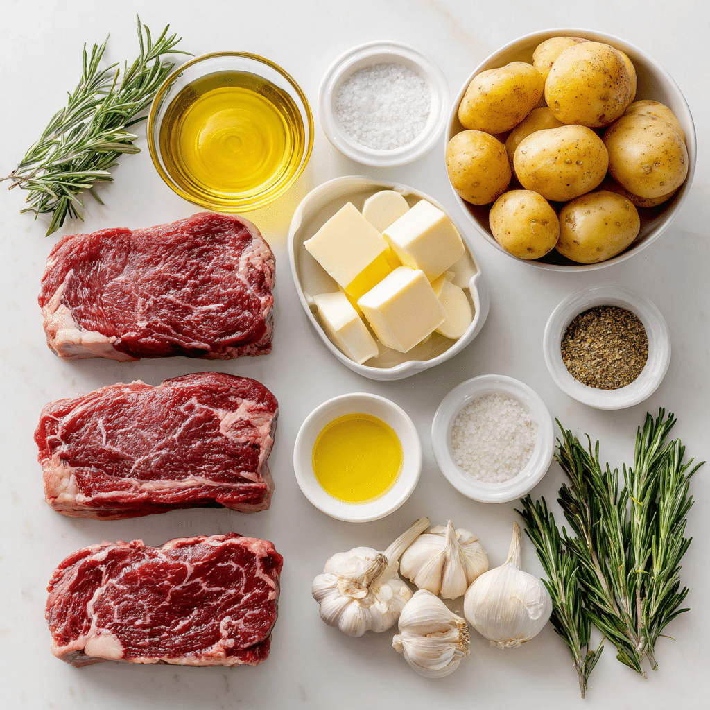 Combine steak, potatoes, butter, oil, garlic, salt, pepper, paprika, and herbs.