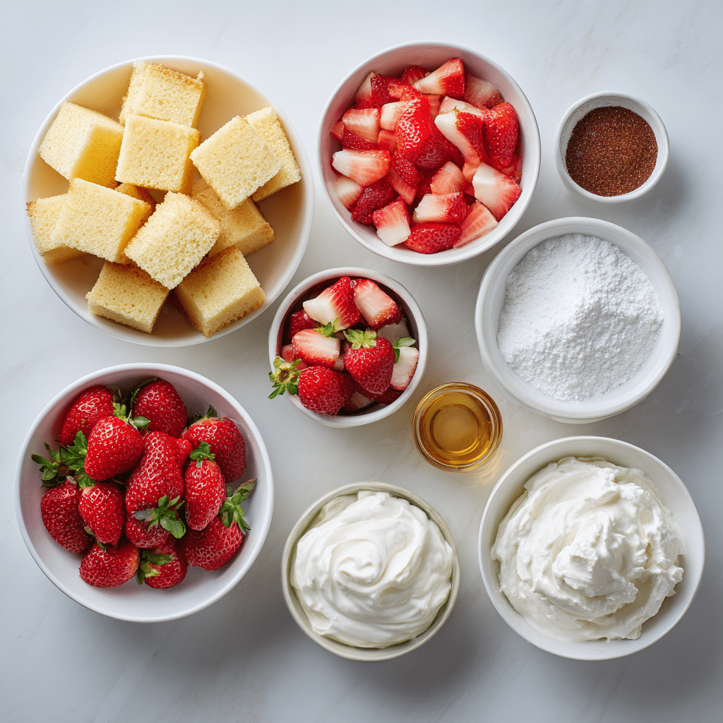 To make strawberry shortcake party shots, you will need pound cake, sponge cake, or angel food cake cut into cubes, fresh strawberries, granulated sugar, whipped cream or whipped topping, and vanilla extract. The cake provides structure, while strawberries add natural sweetness and freshness.