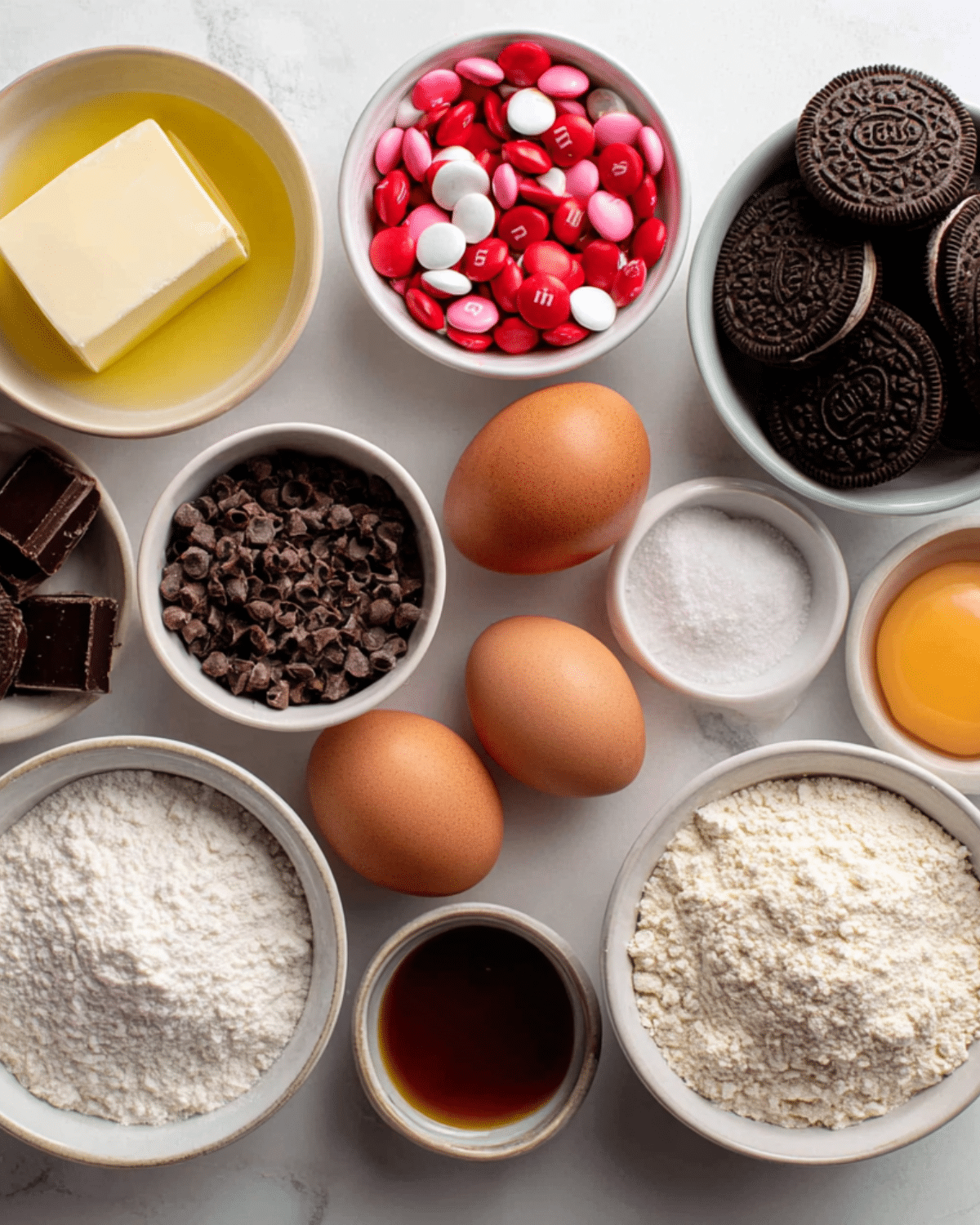 When it comes to baking the best Valentine’s Day Oreo M&M Cookies, every ingredient counts. The mix of creamy butter, sugar, and chocolate creates that irresistible chewy texture we all love. Below is a complete list of ingredients to make about 24 cookies.