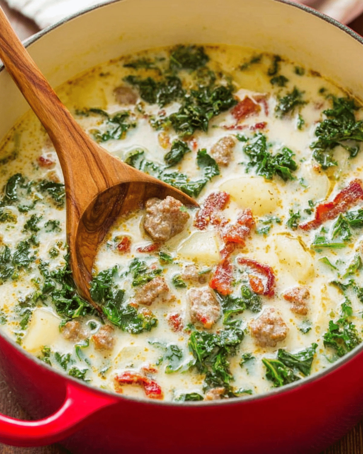 Zuppa Toscana Soup is a hearty, creamy Italian-American soup loaded with spicy Italian sausage, crispy bacon, tender potatoes, and kale, all simmered in a flavorful garlic-infused broth.